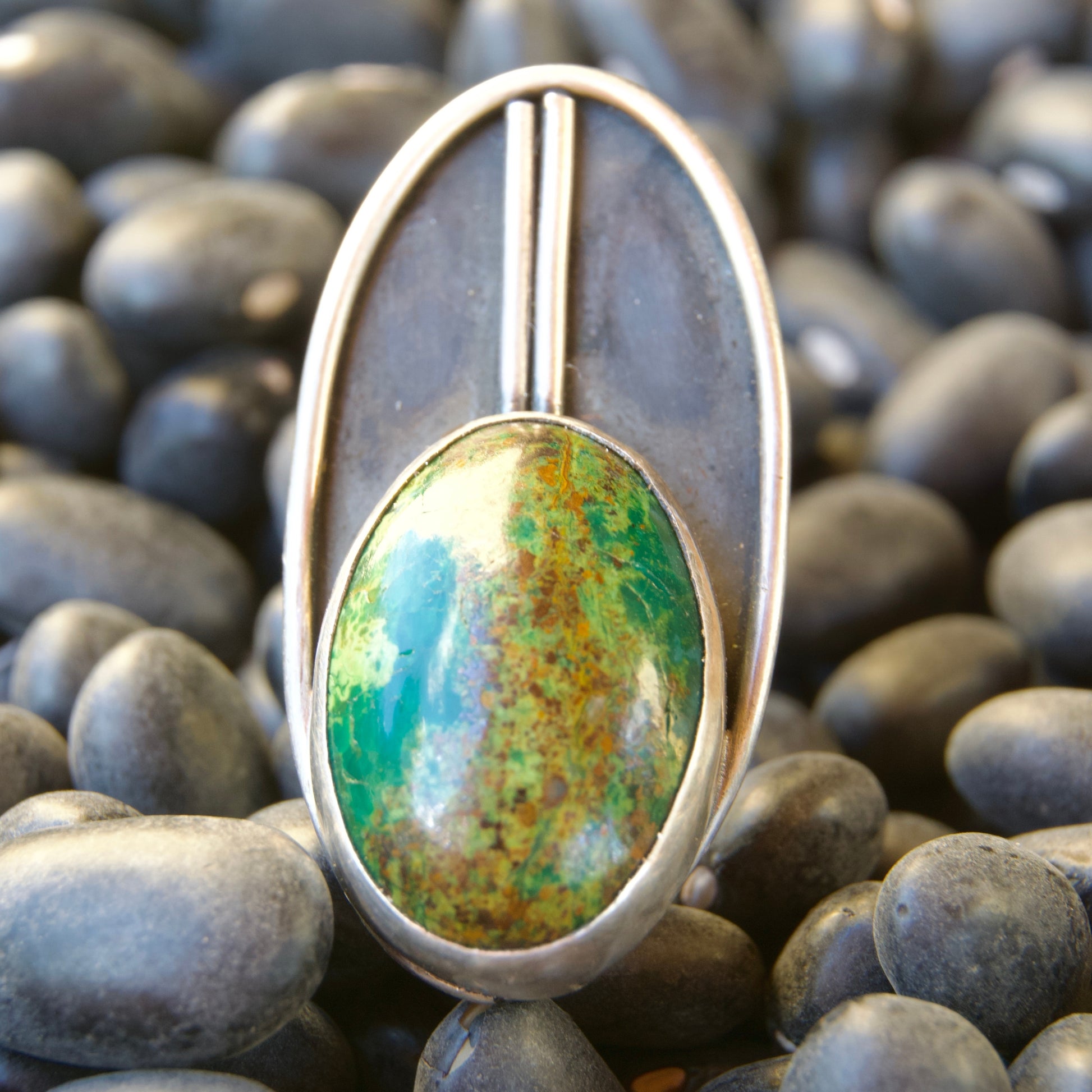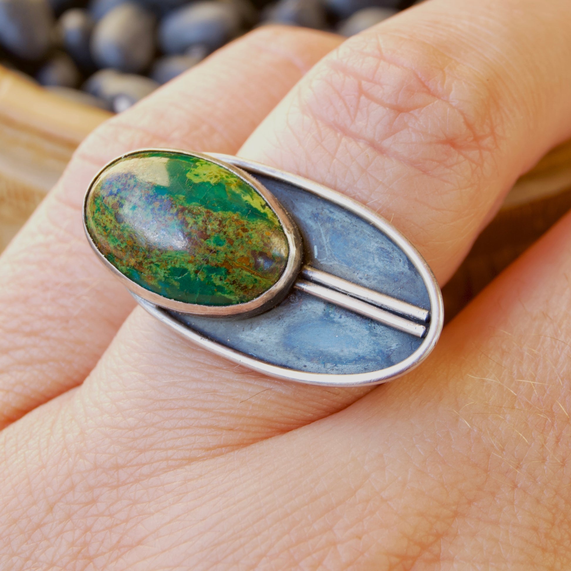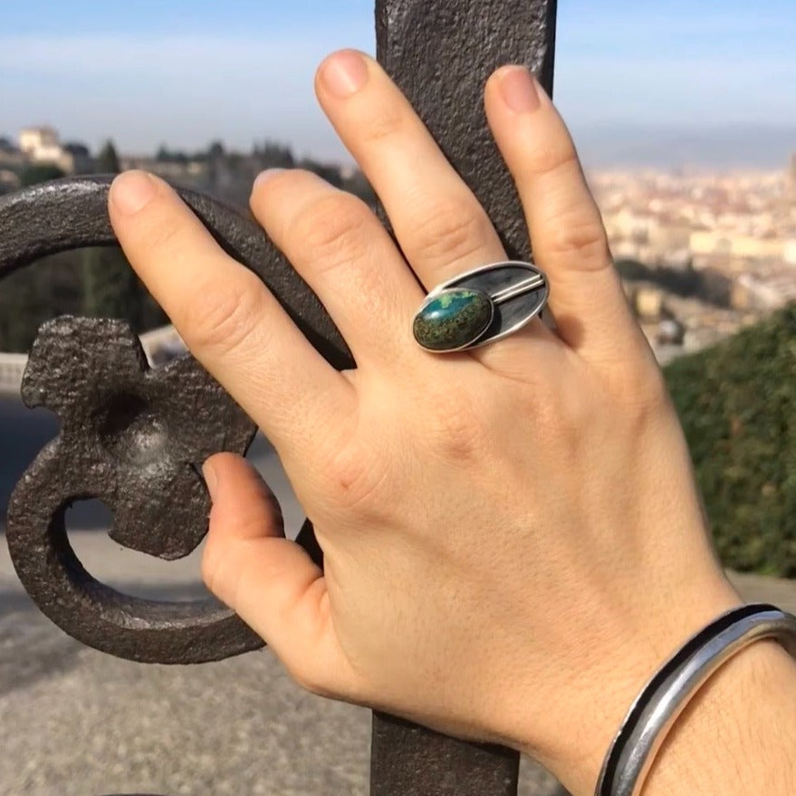 Inspired by the cicada. Their hypnotizing chant are what make them one of my very favorite insects. Cicadas in Costa Rica burst with intense greens and blues, which is why Chrysocolla was the perfect choice of stone for this piece.