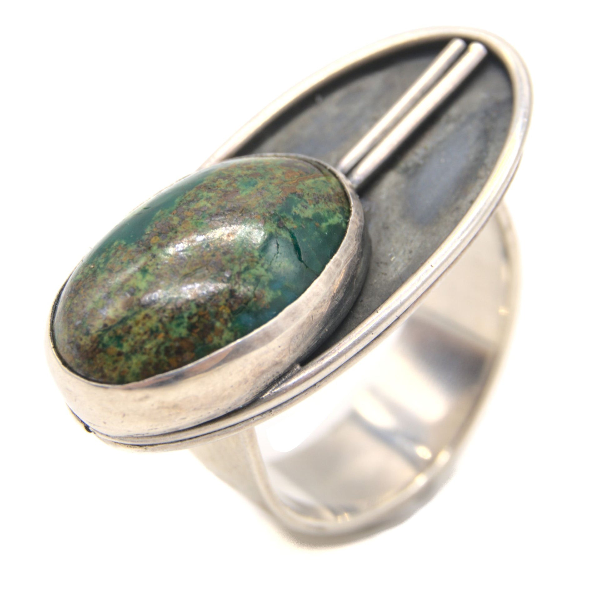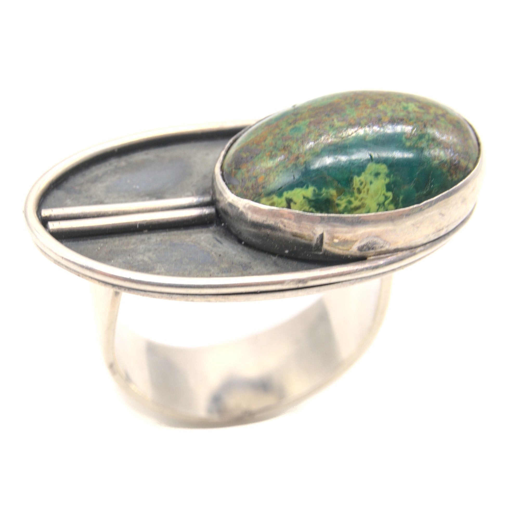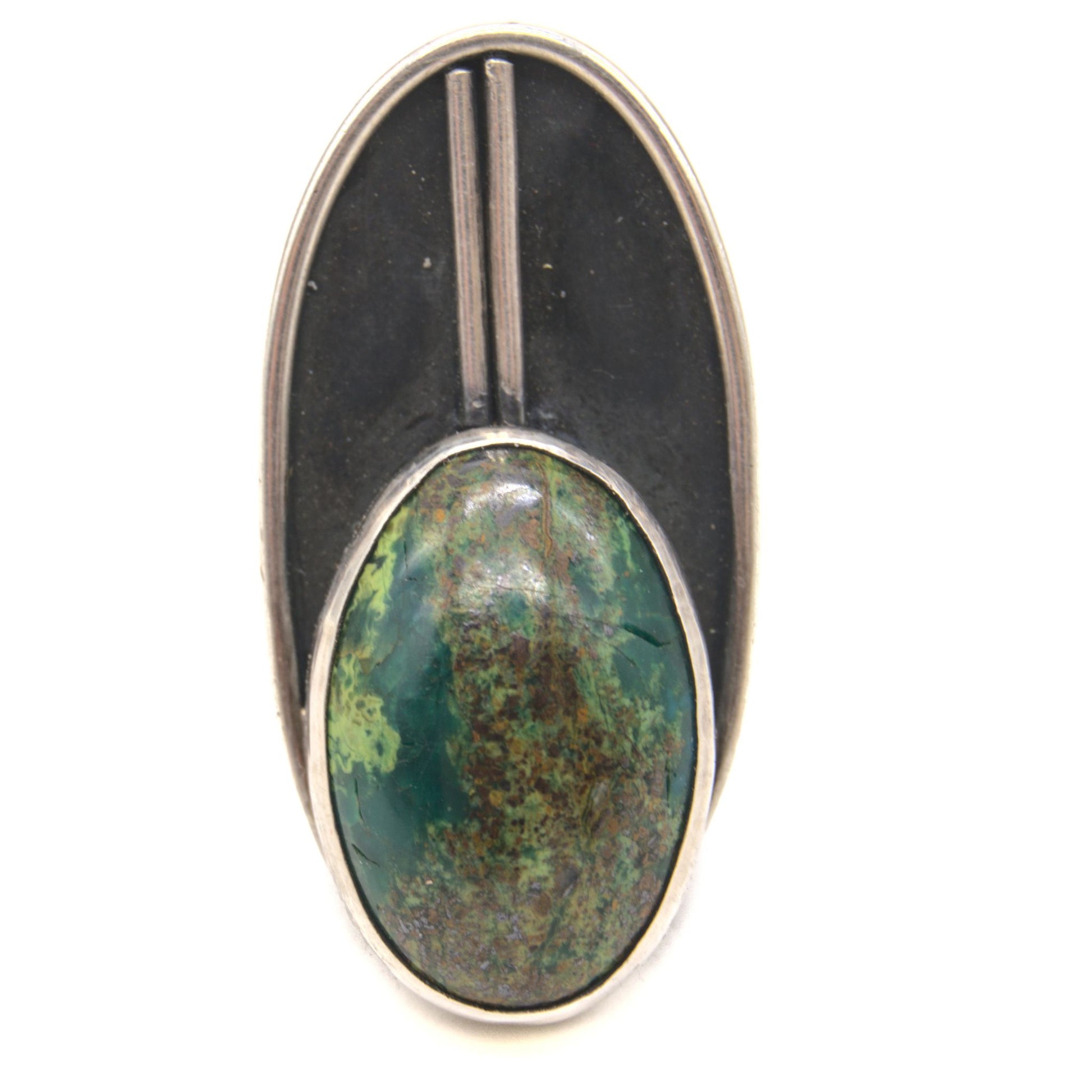 Inspired by the cicada. Their hypnotizing chant are what make them one of my very favorite insects. Cicadas in Costa Rica burst with intense greens and blues, which is why Chrysocolla was the perfect choice of stone for this piece.