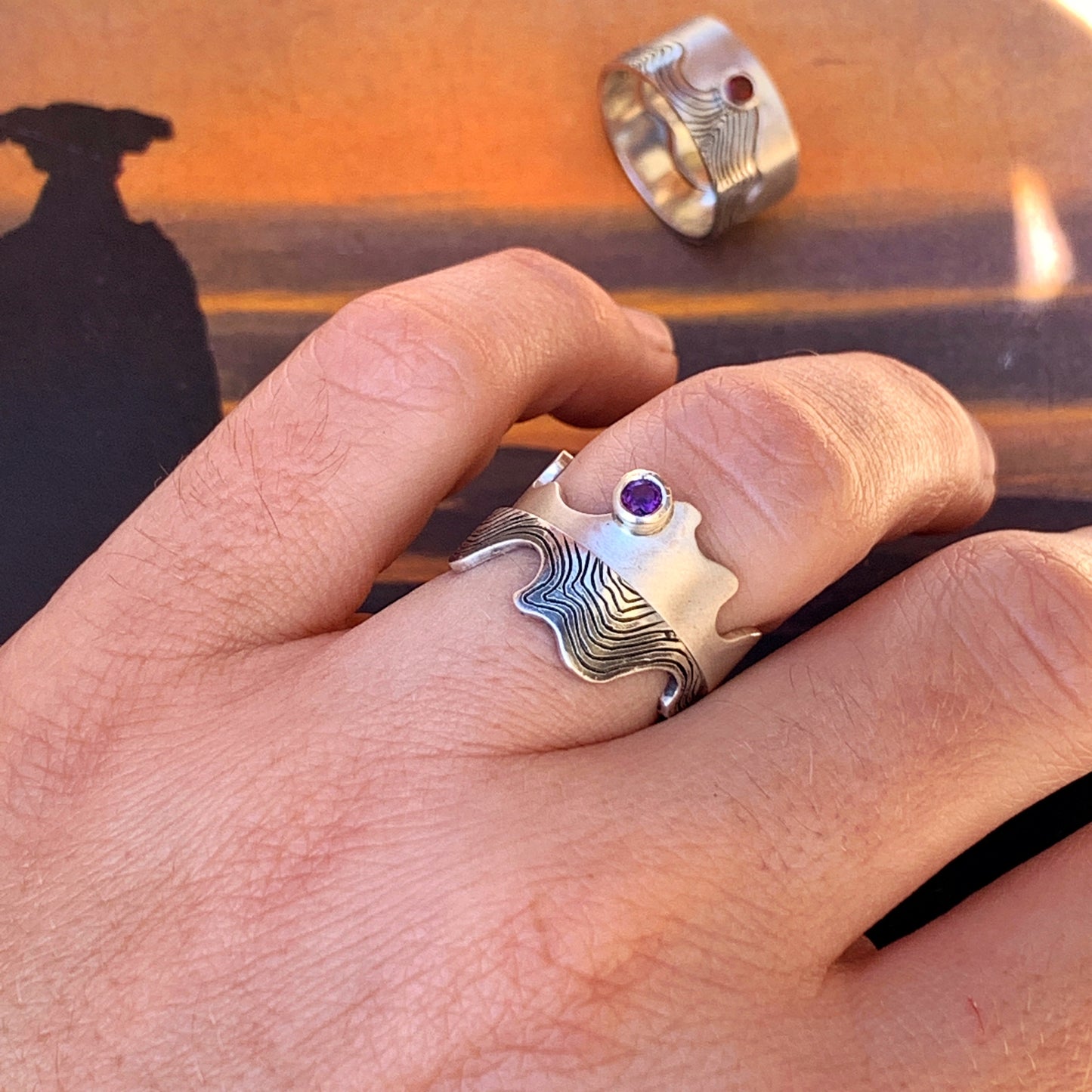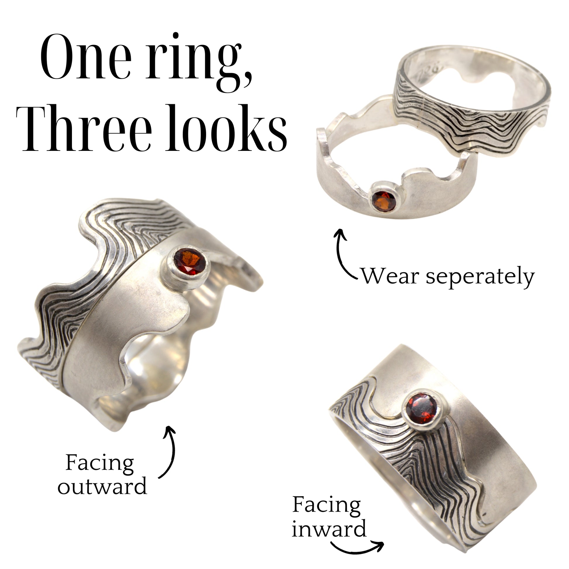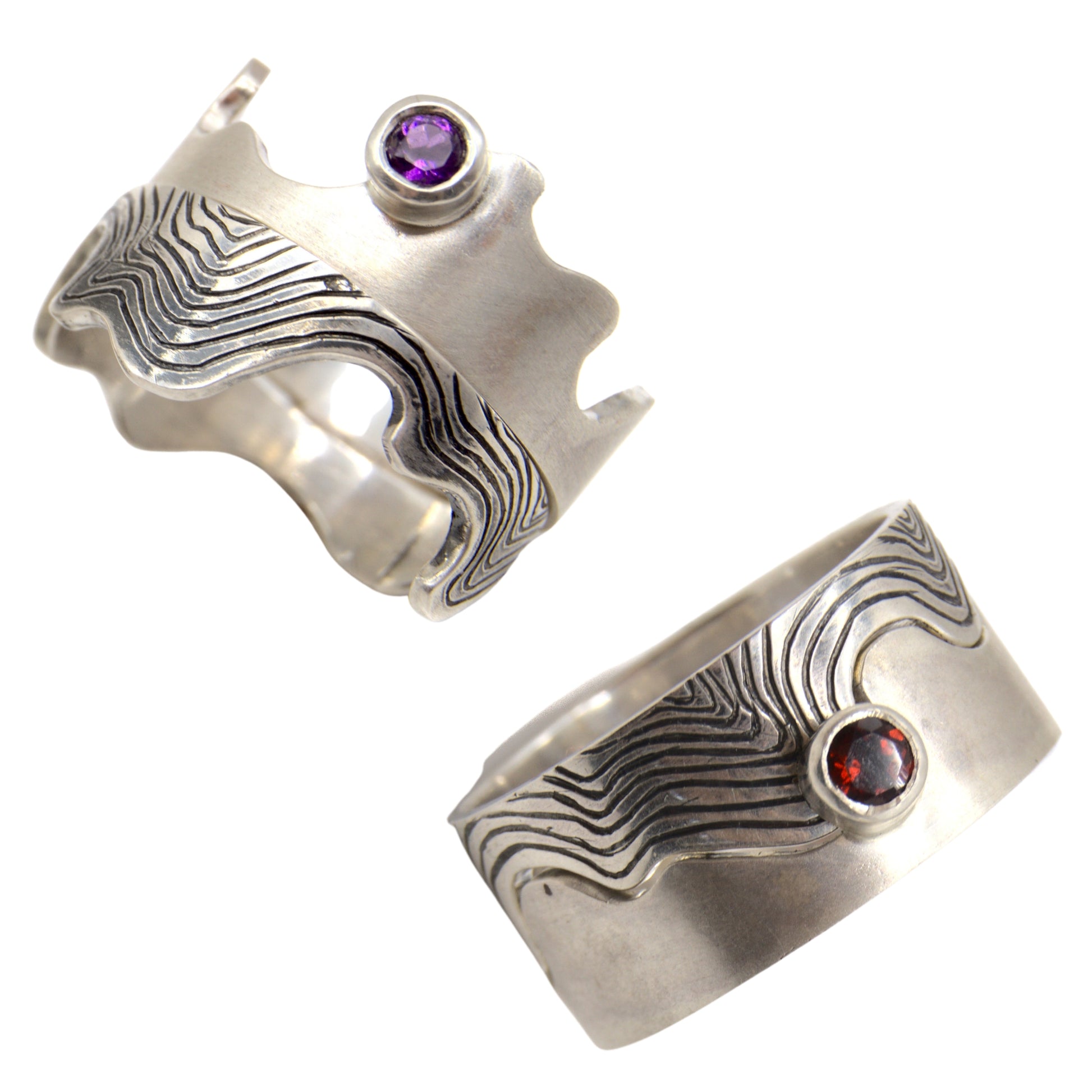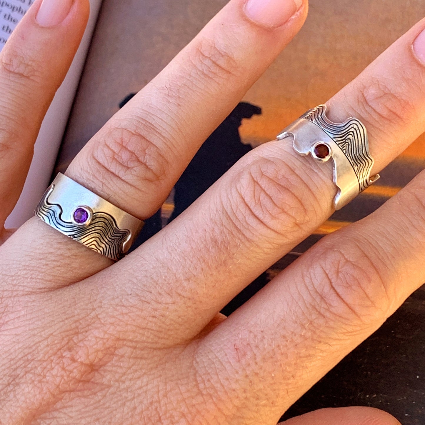 One of the rings has a matt silver finish complemented by a beautiful pop of color from its natural gemstone. The other features a continuous, abstract pattern meticulously carved into the metal by hand-push engraving.