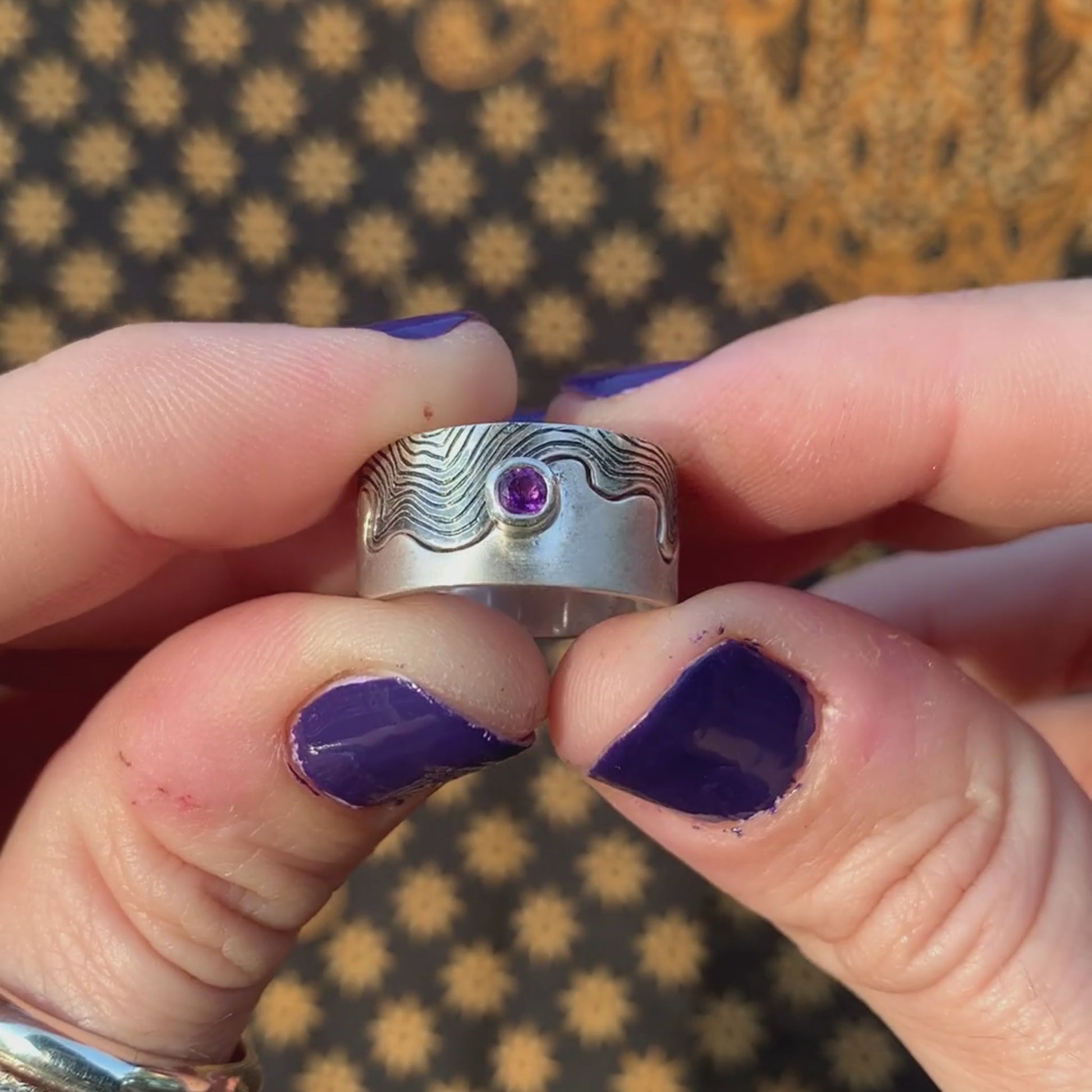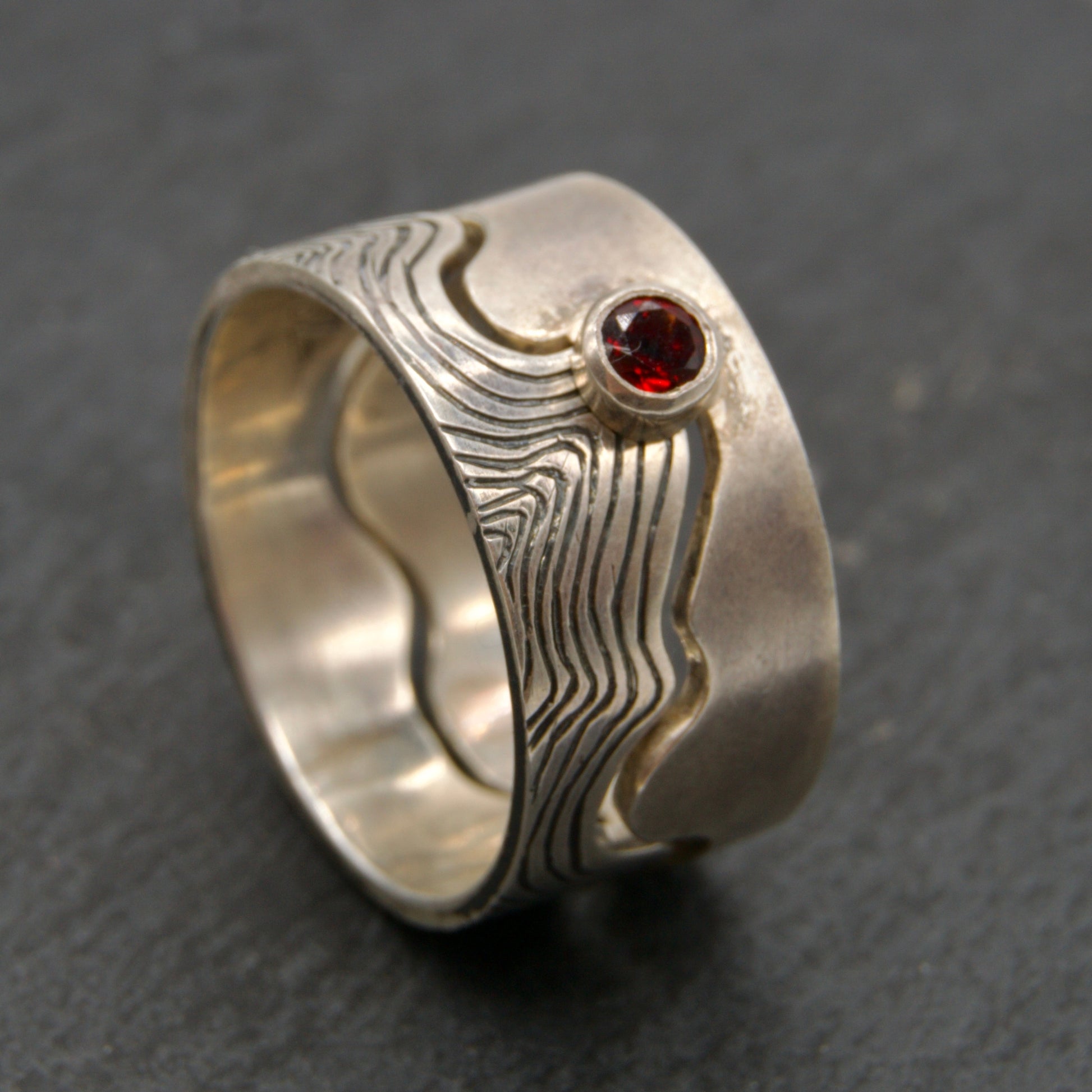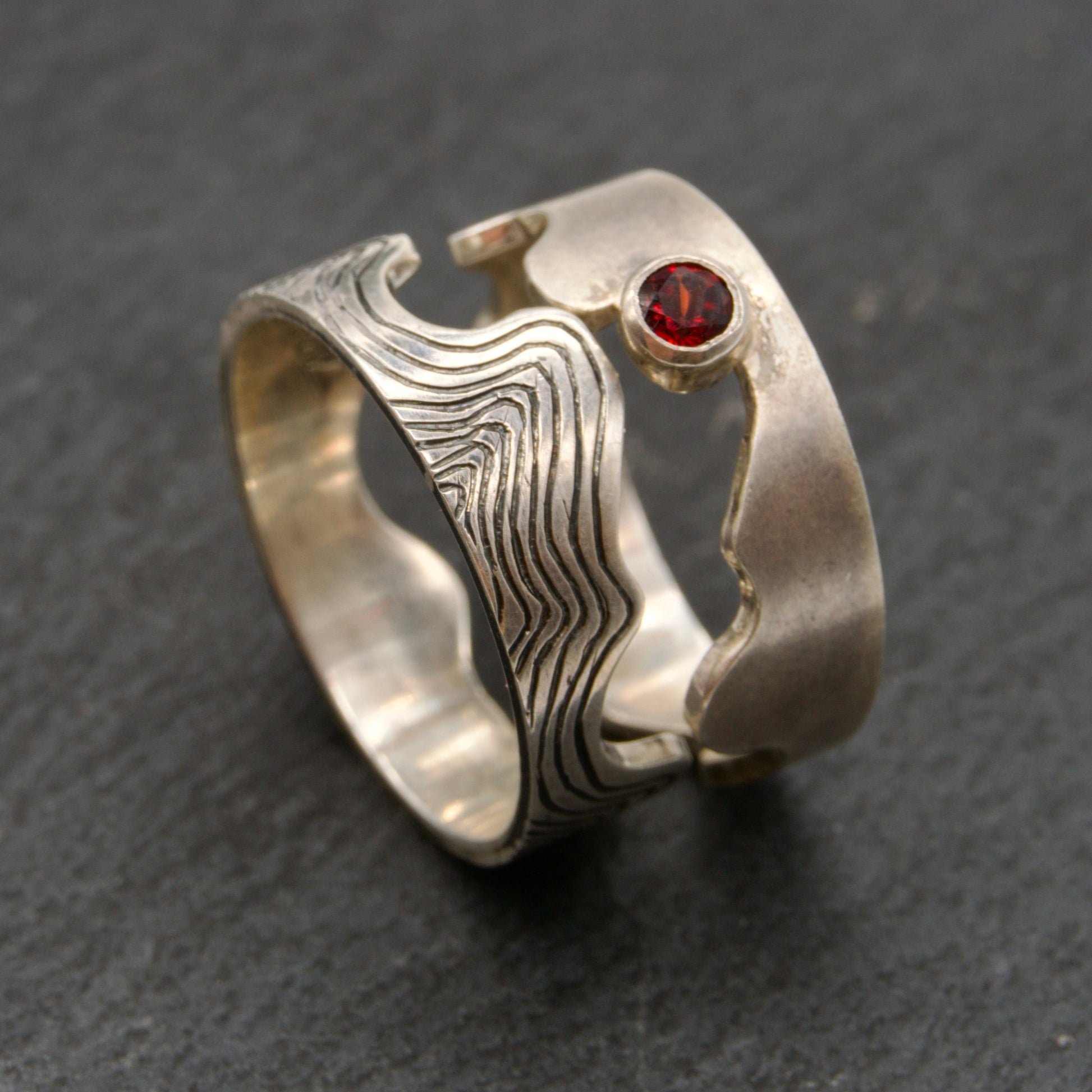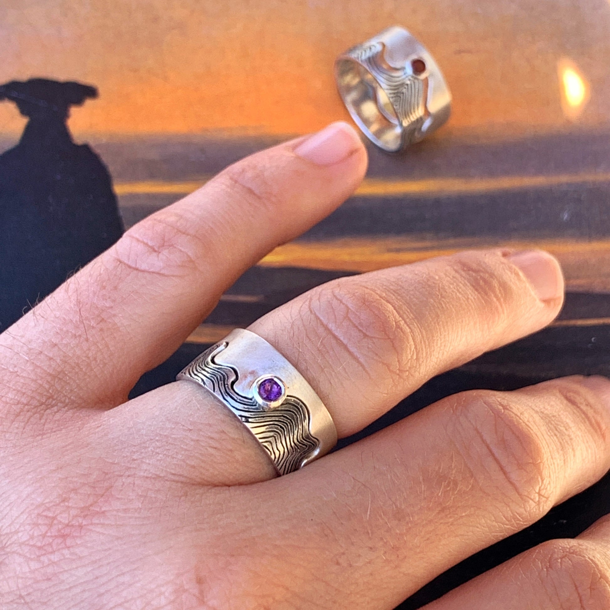 One of the rings has a matt silver finish complemented by a beautiful pop of color from its natural gemstone. The other features a continuous, abstract pattern meticulously carved into the metal by hand-push engraving.