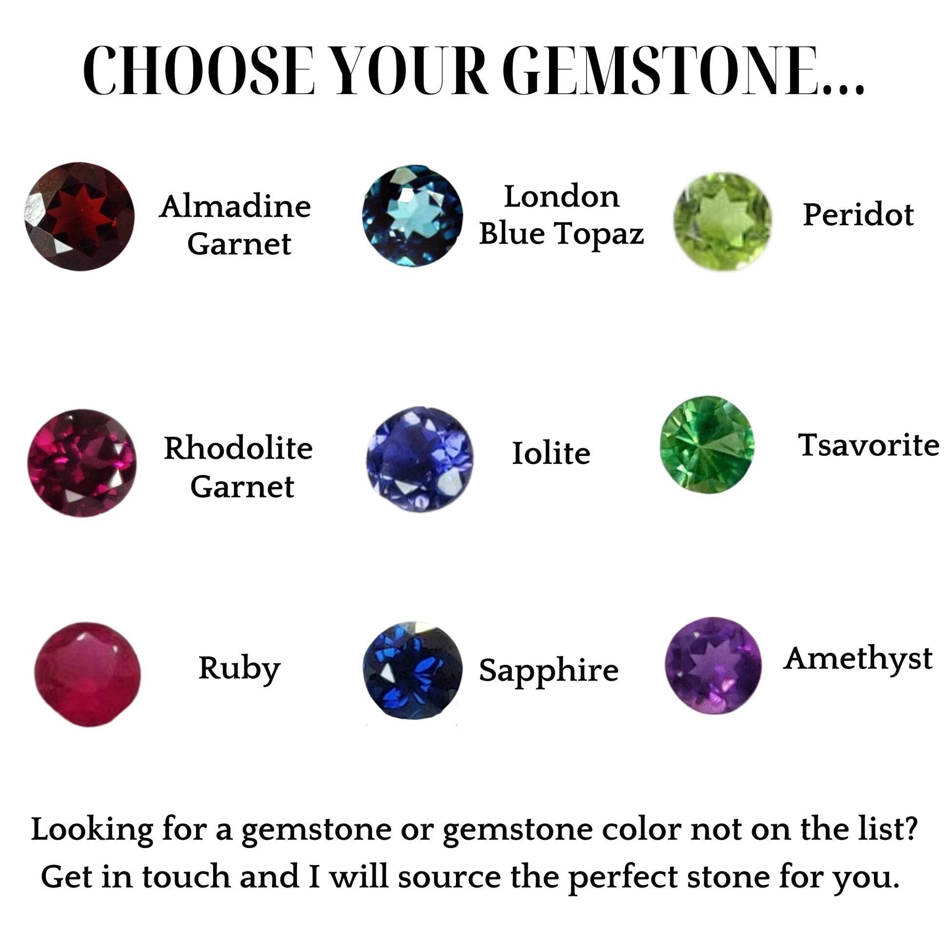 Gemstones- My website has an *annoying* technical limitation making it so I can't display all 9 gemstone options. If you are after one of the stones in the photo that is not in the drop-down menu, pick Amethyst, but tell me your true choice at checkout.