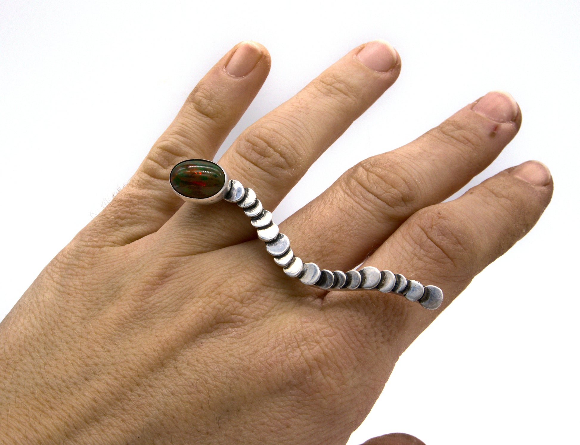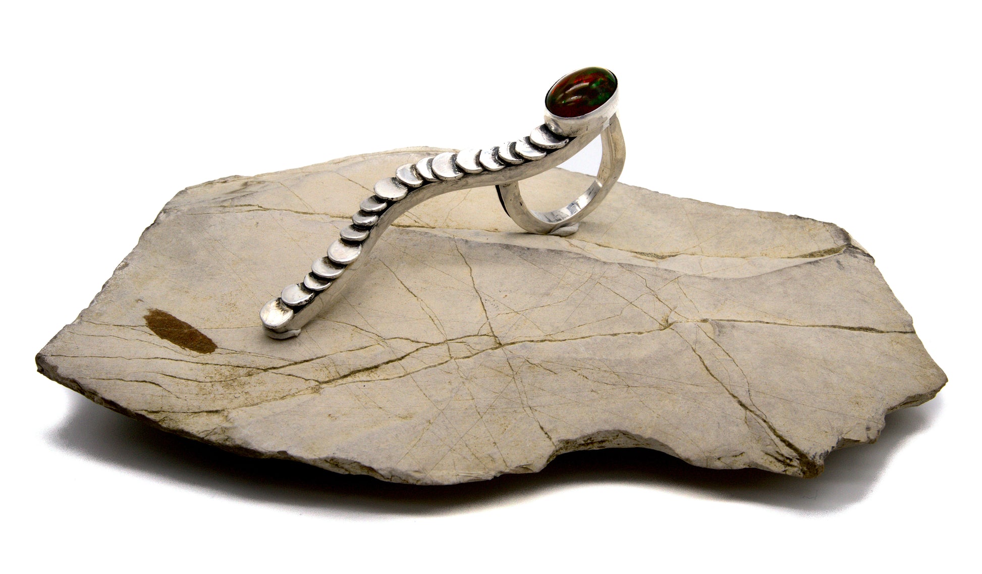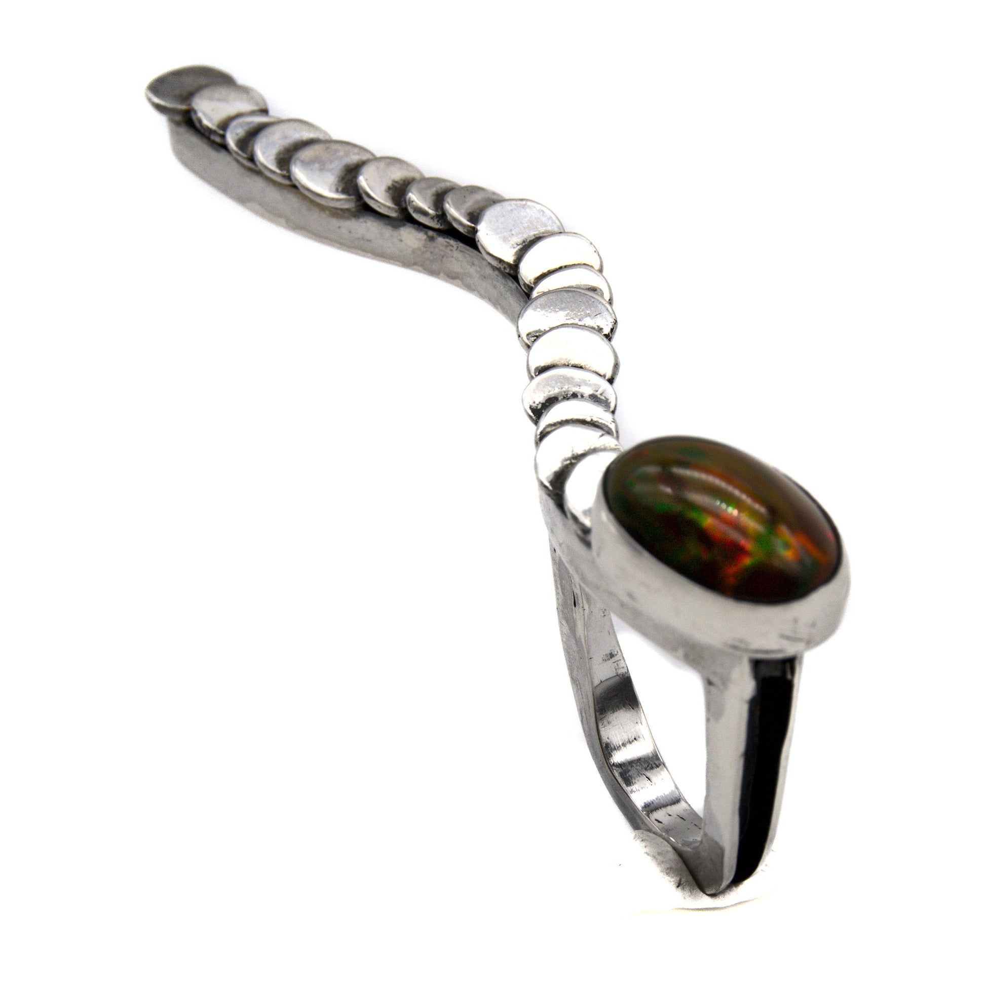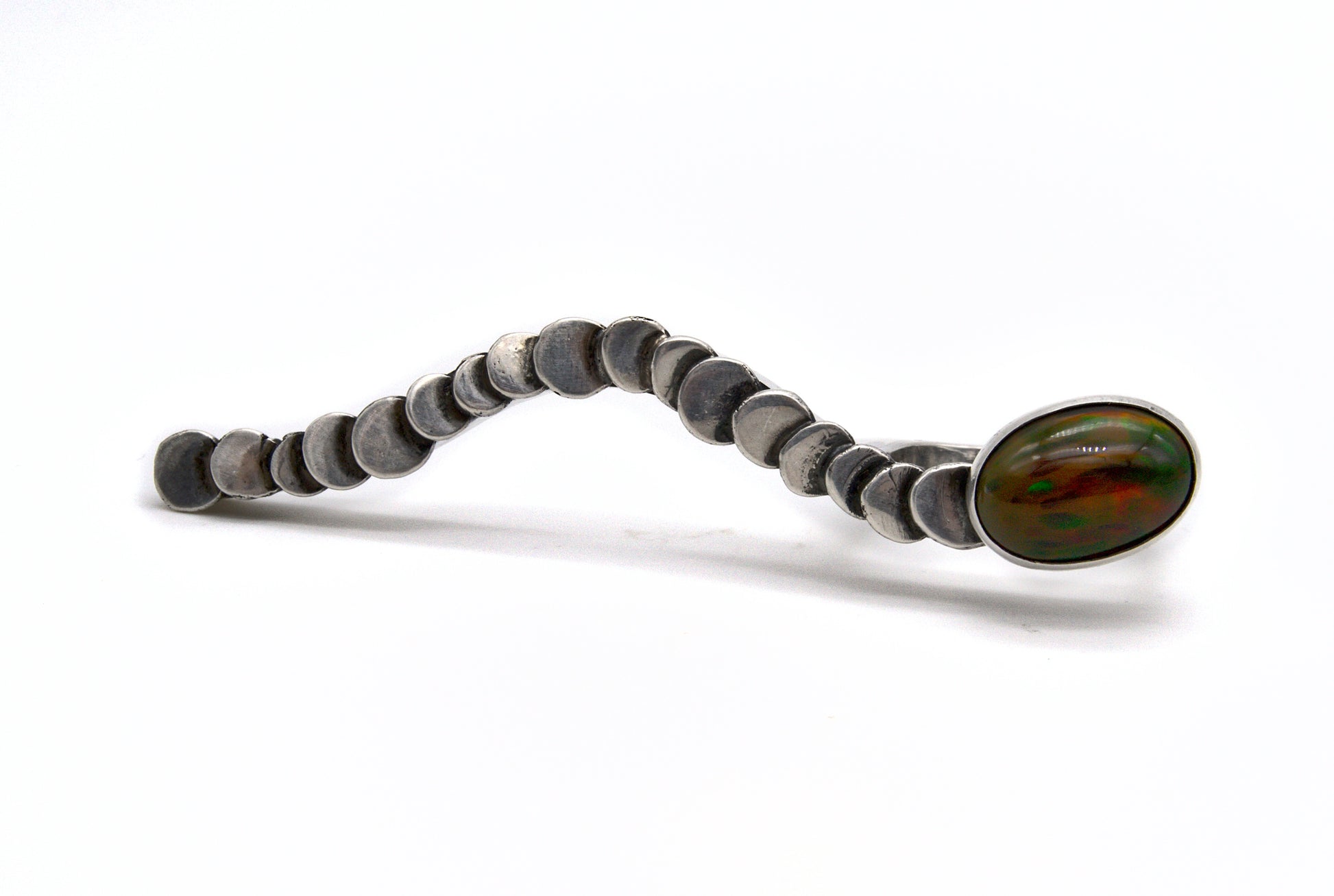 It features an amazing opal that flashes reds, greens and yellows depending on the lighting. A flow of silver pebbles will dance accross the top of your fingers, making for a playful and unique ring.