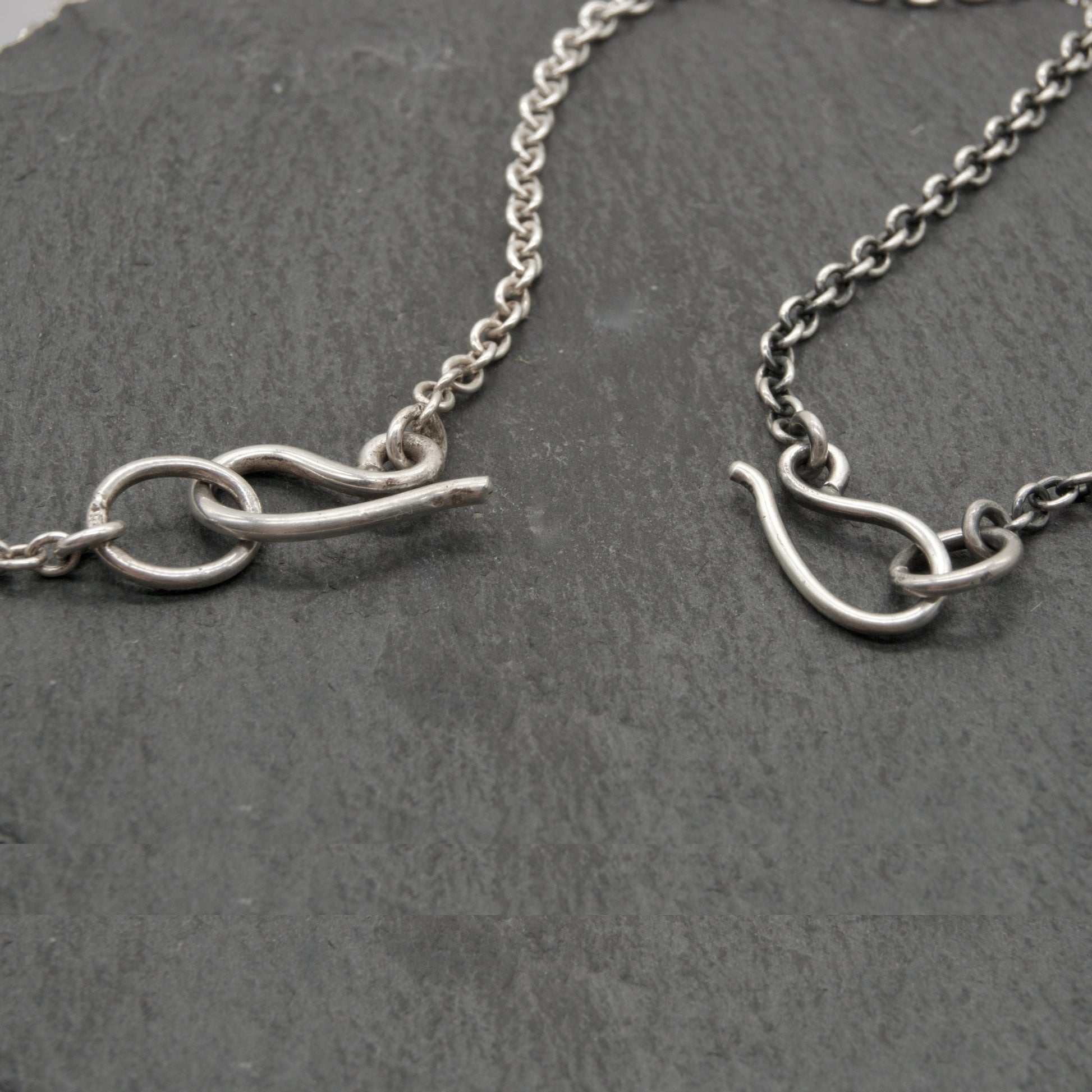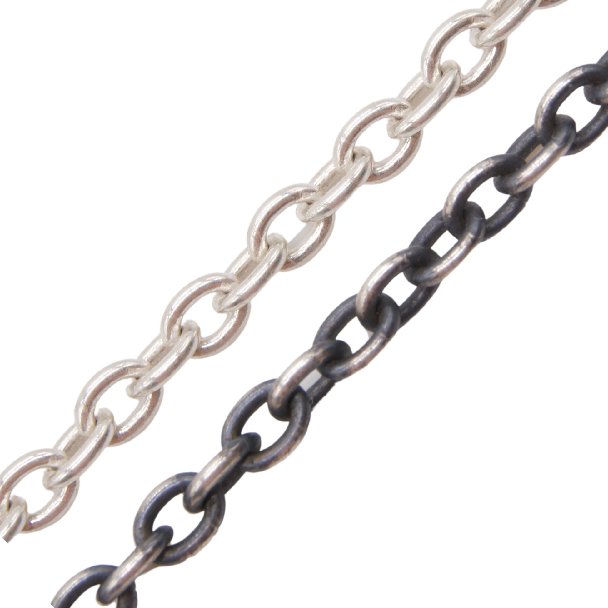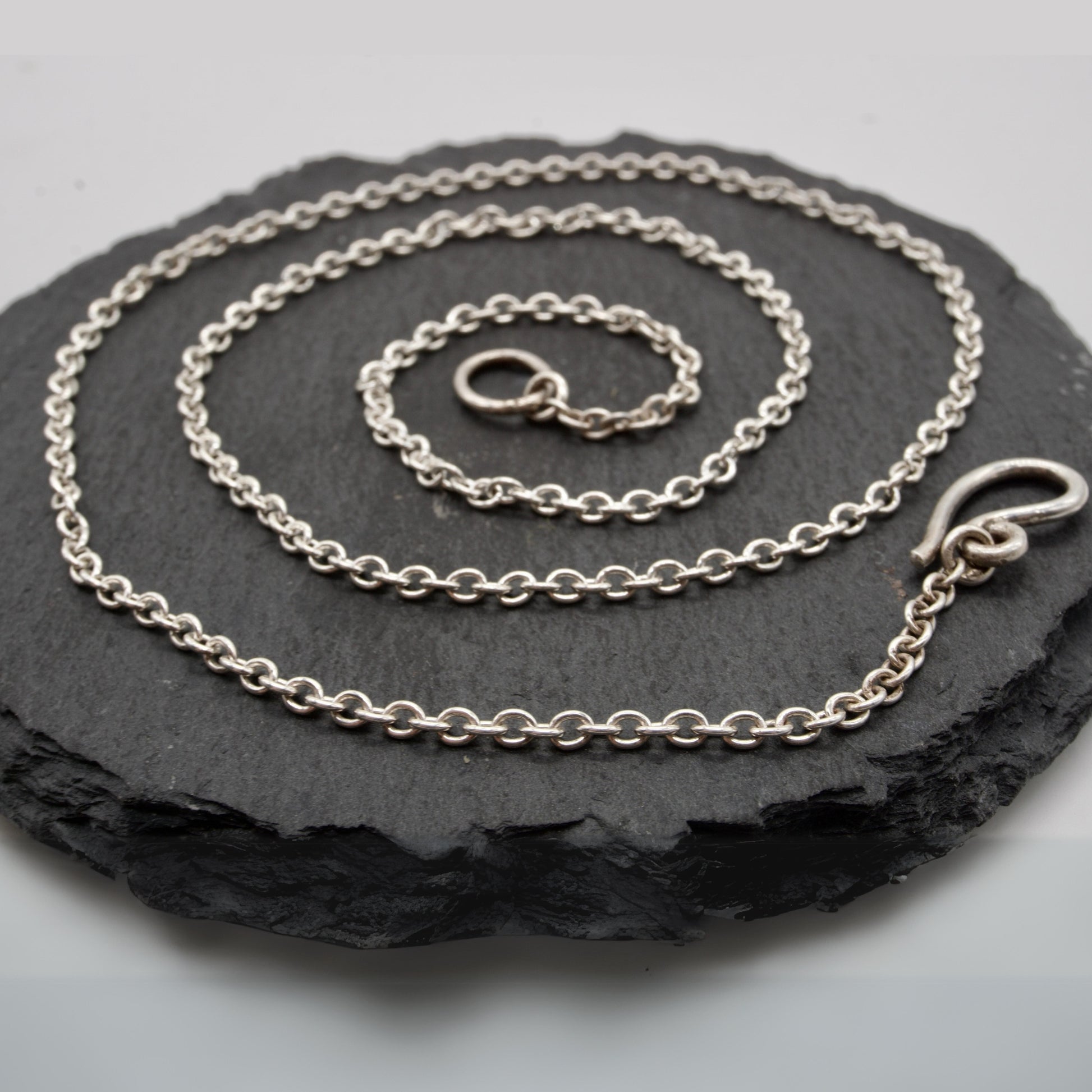 A rolo chain is a staple for mixing and matching charms and pendants. It is a classic and strong chain style, with oval-shaped solid silver links. Choose your preferred length, weight, and finish, and I will cut the chain to any length for you, and add a handmade clasp at the end.