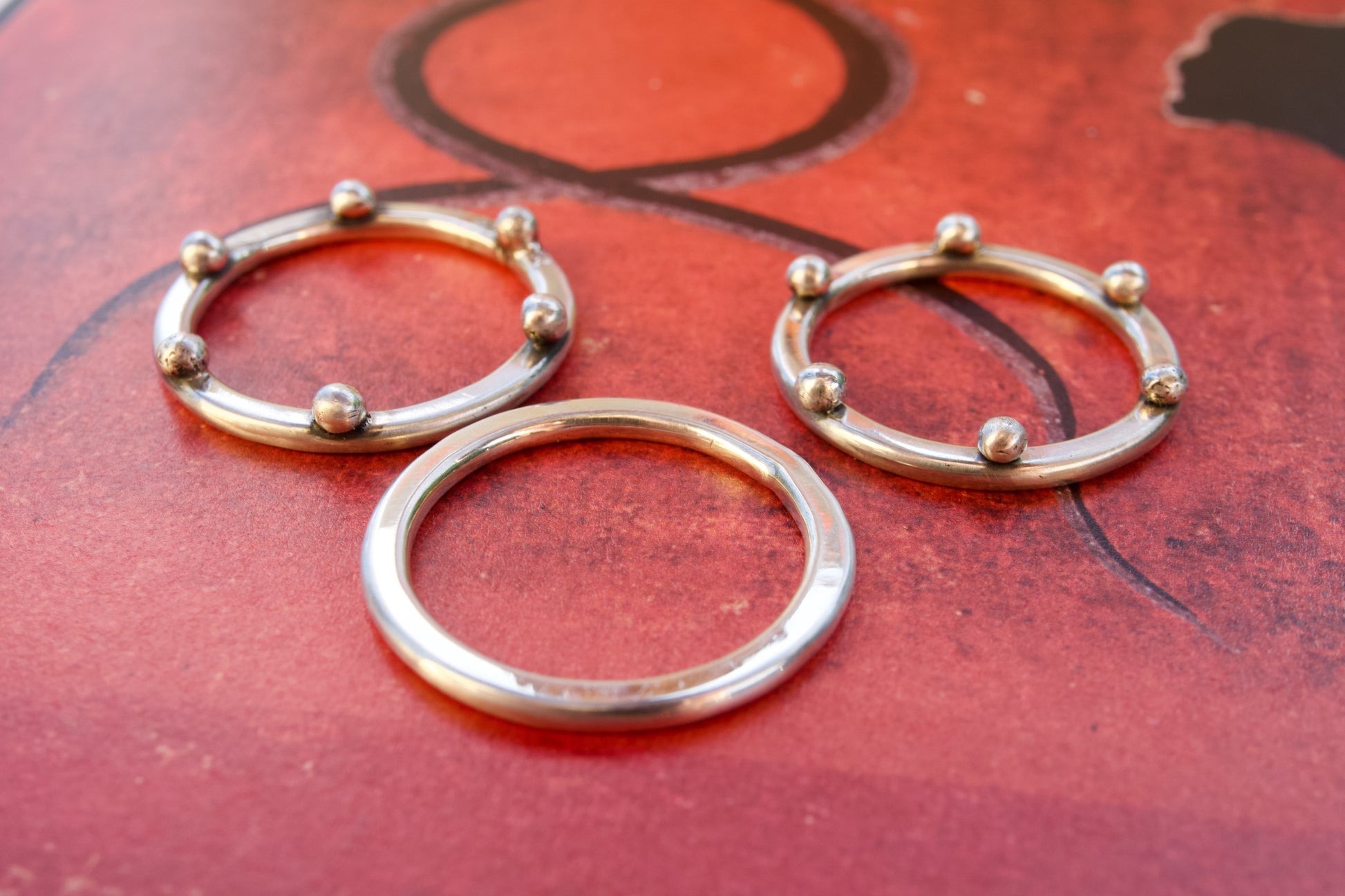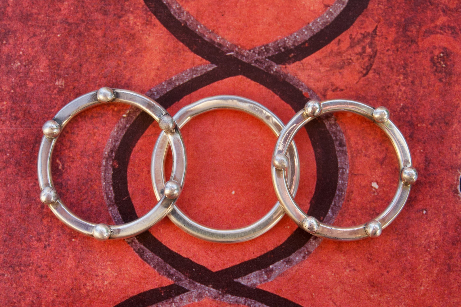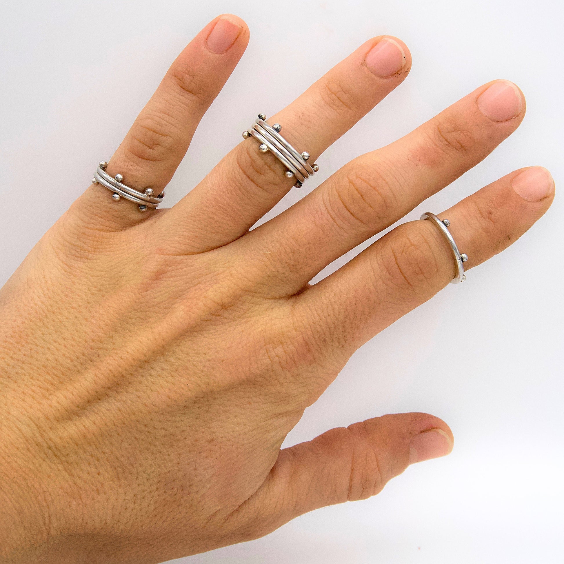 The Dot Stack is a playful ring set of three, and will give you over a dozen different ways to wear them. Wear one band for a dainty and feminine look, mix and match with your ongoing stacking rings collection or wear all three together to get all of the different possible combinations.