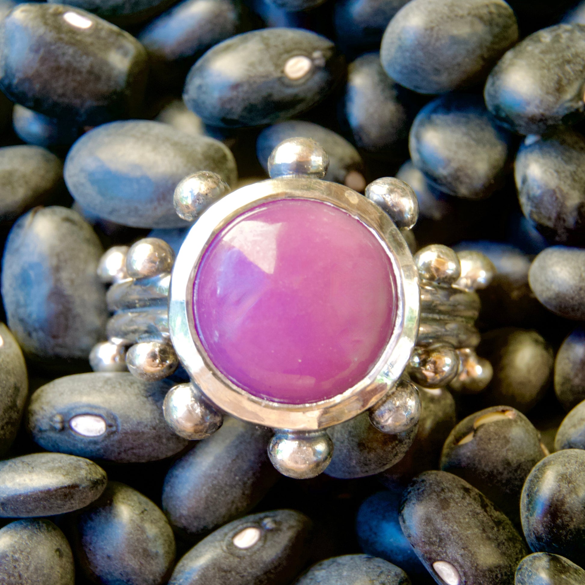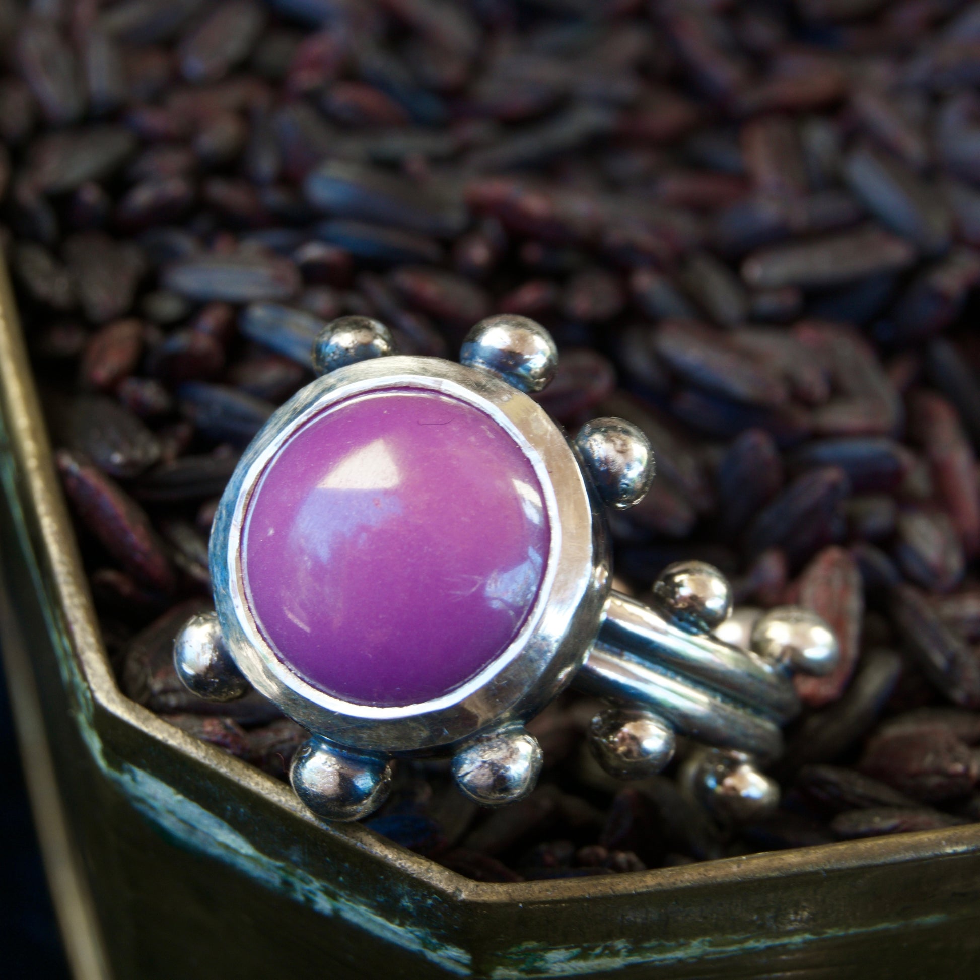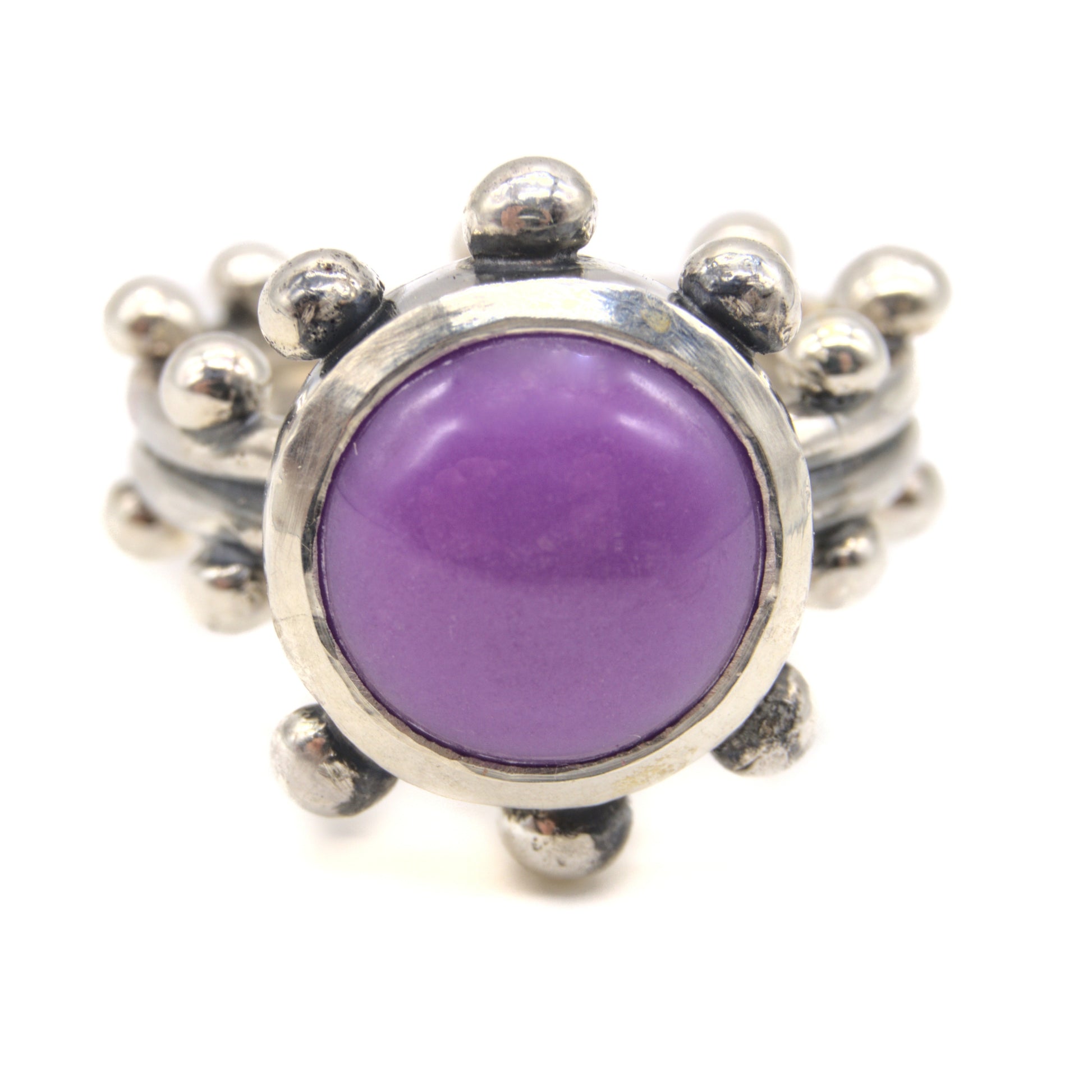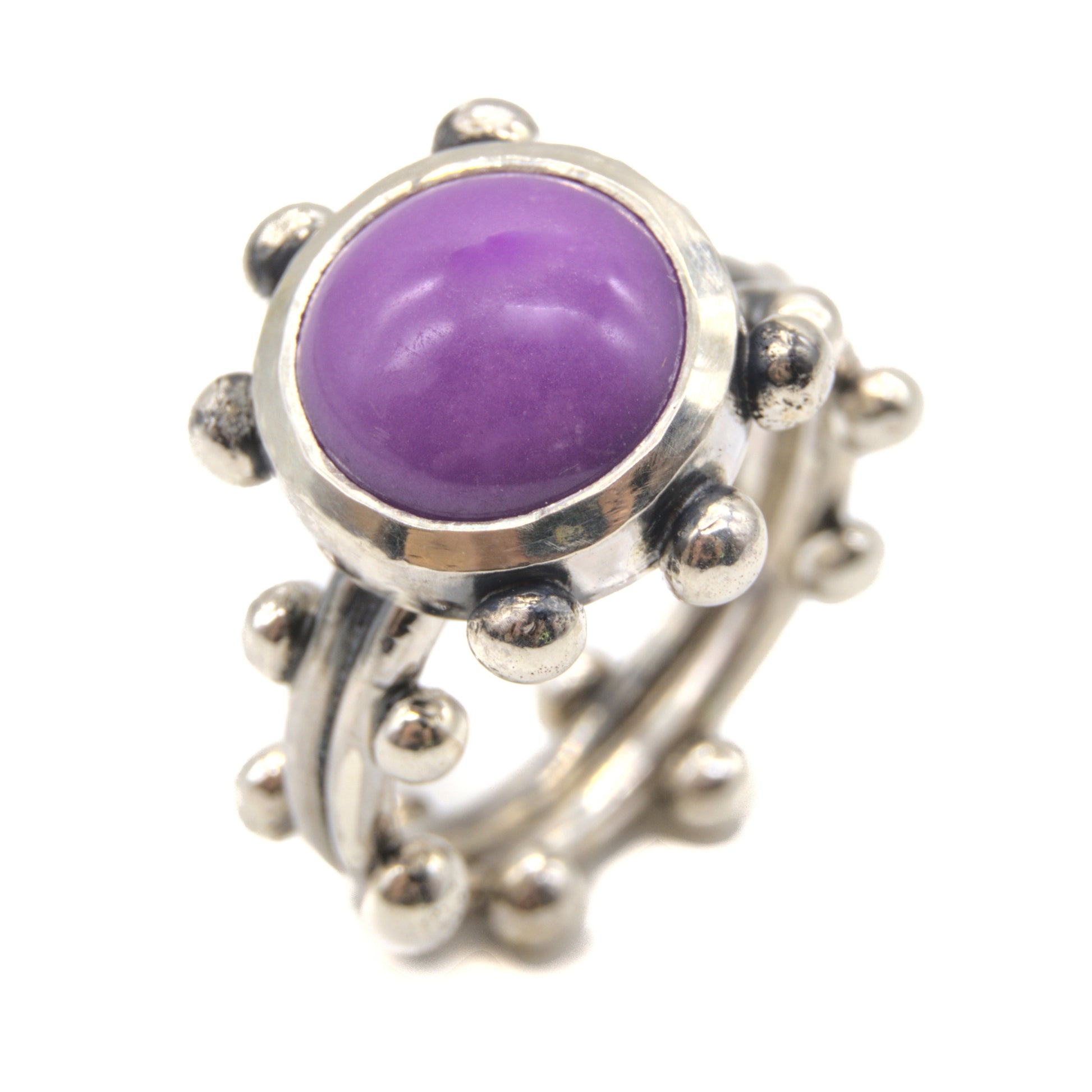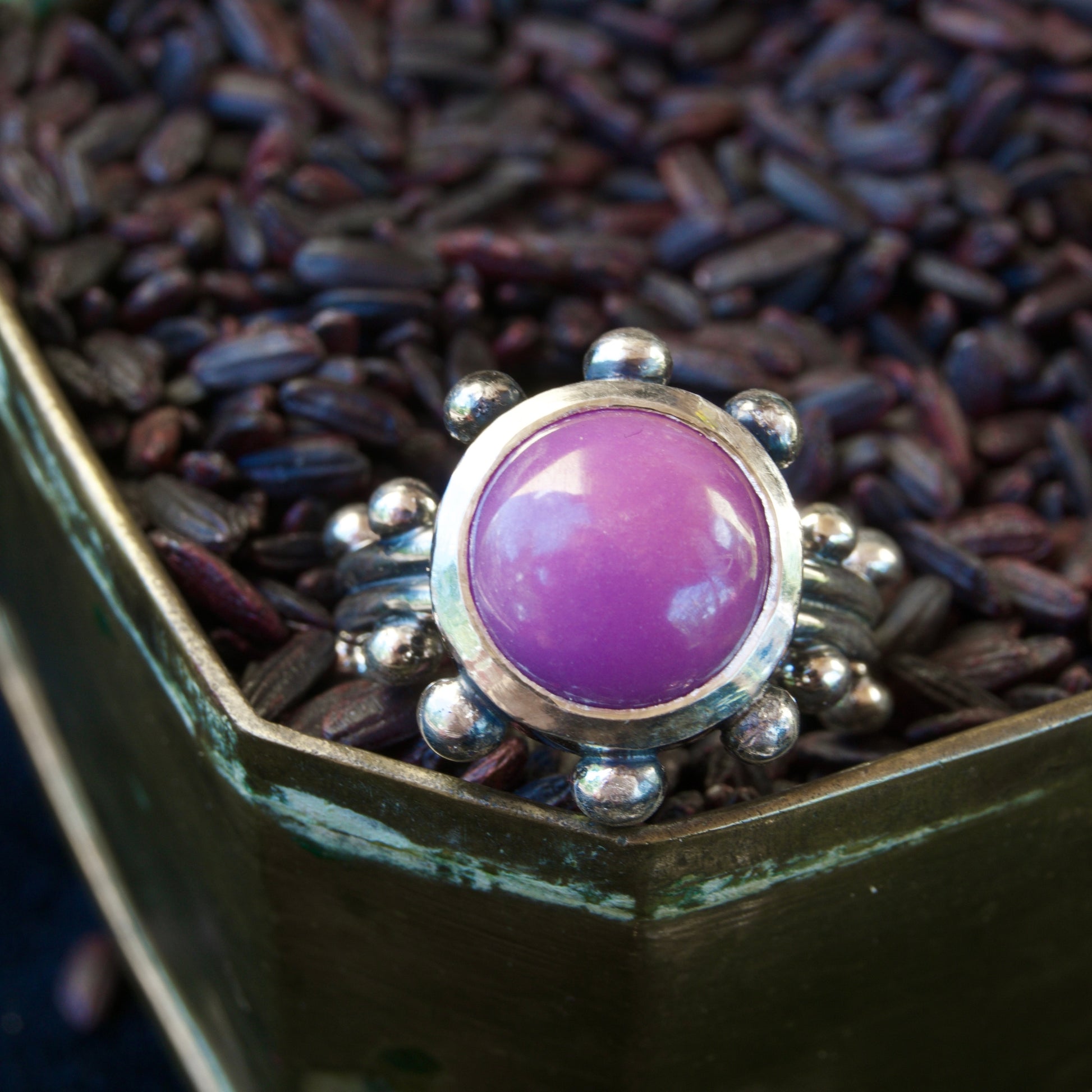 The Otherworldy Connection Ring features a Heterosite center stone with bold silver granules encircling both the gem and band, emmit an essence of etherealness and the cycles of the universe.