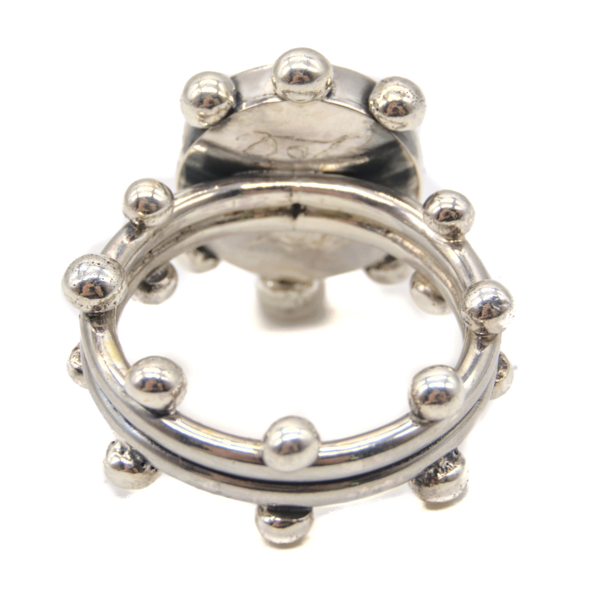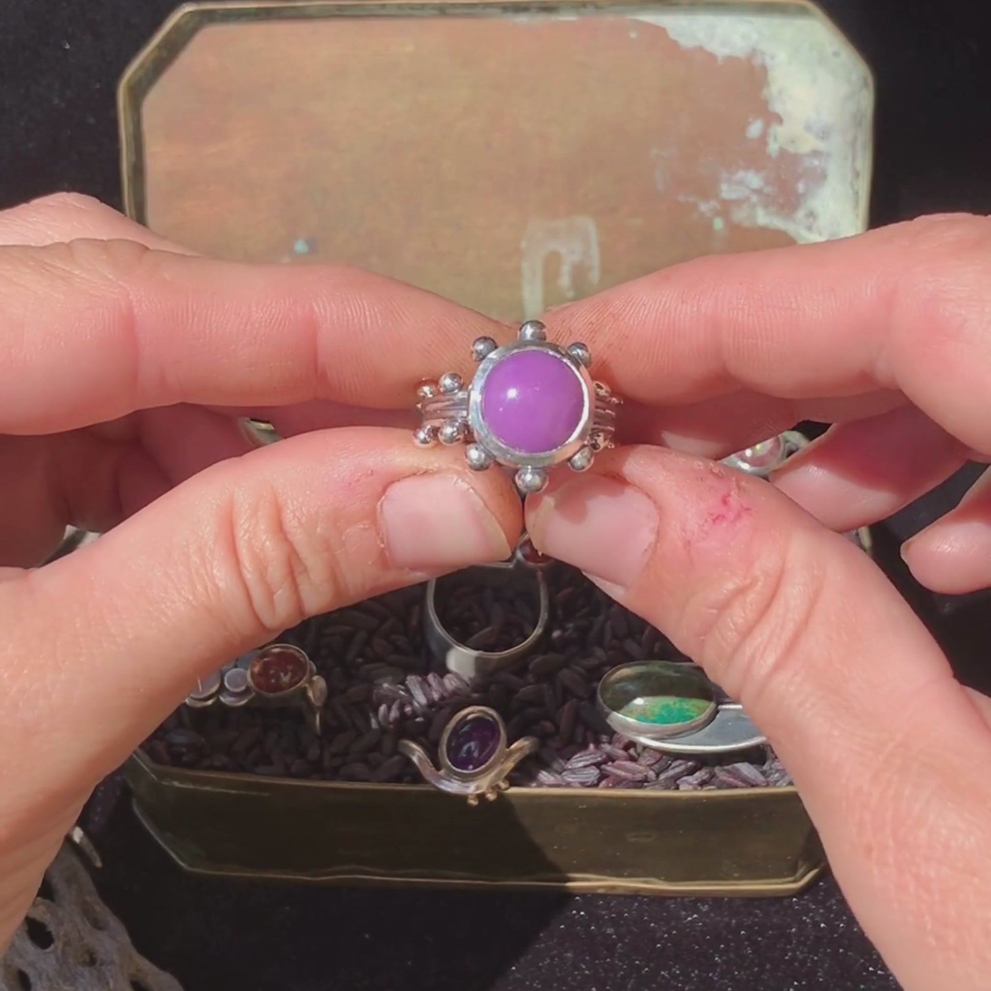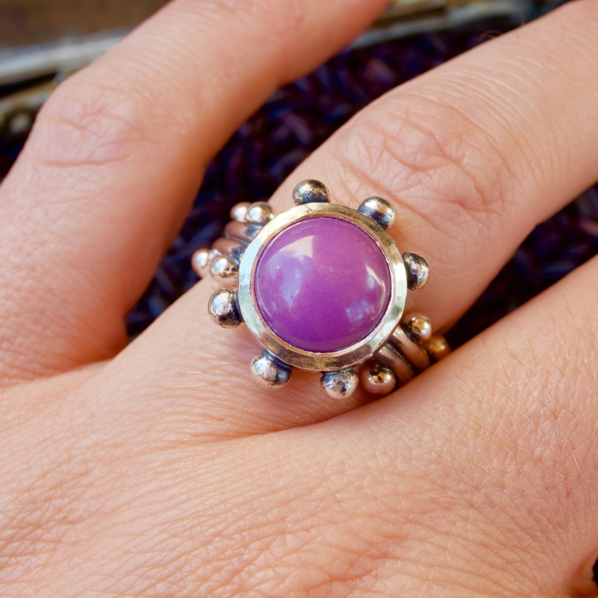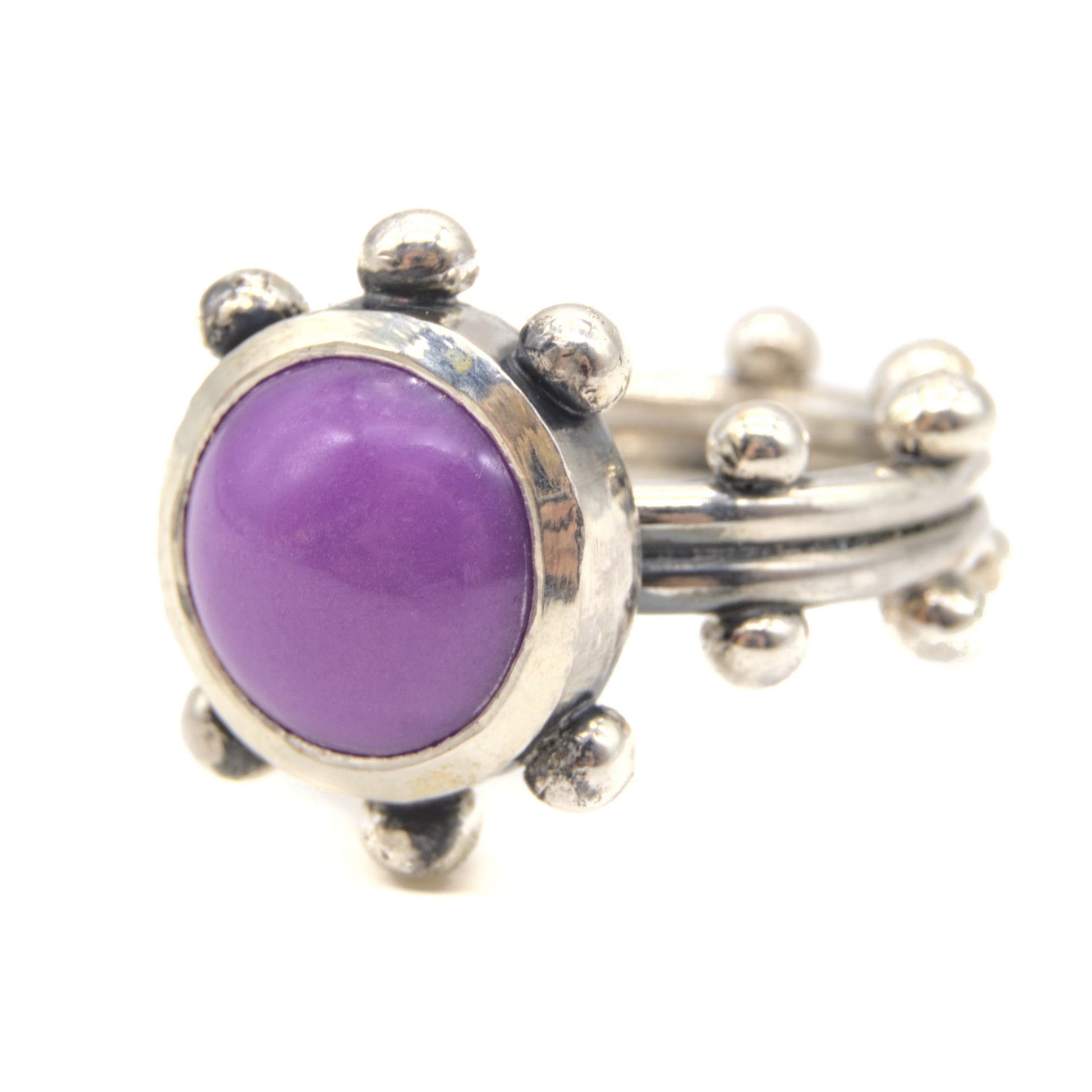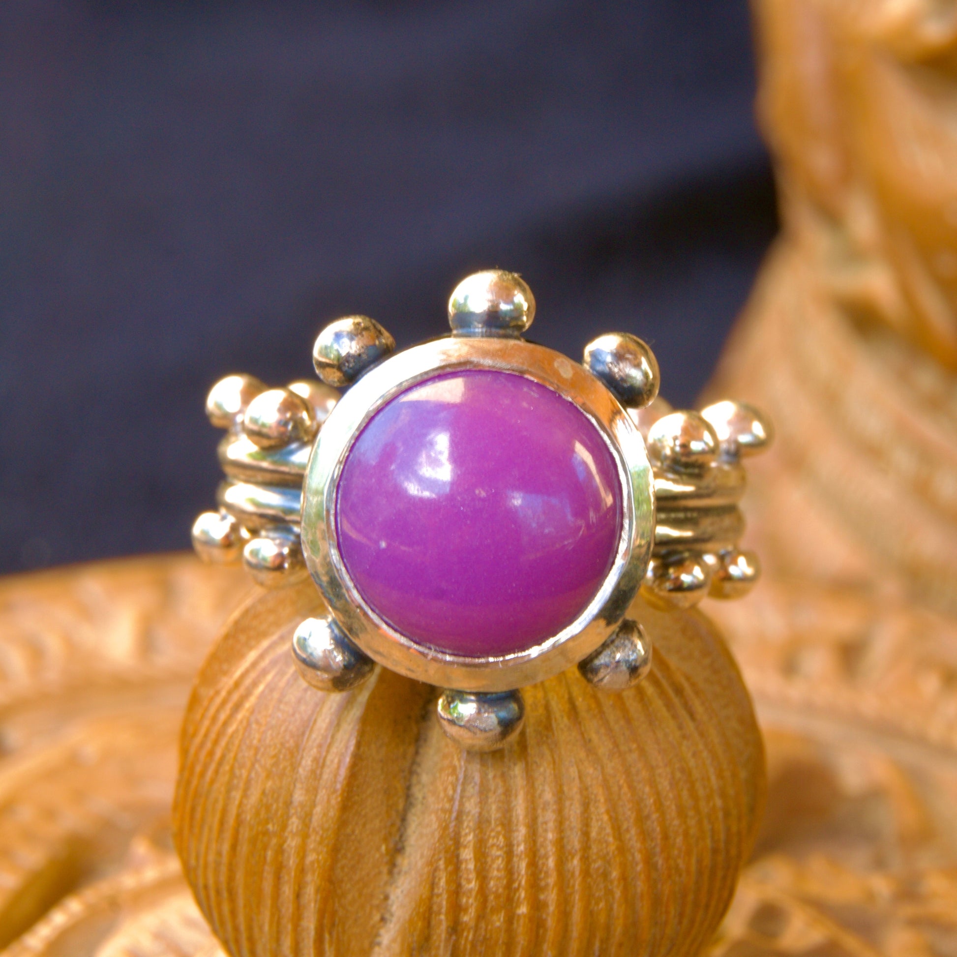 The Otherworldy Connection Ring features a Heterosite center stone with bold silver granules encircling both the gem and band, emmit an essence of etherealness and the cycles of the universe.