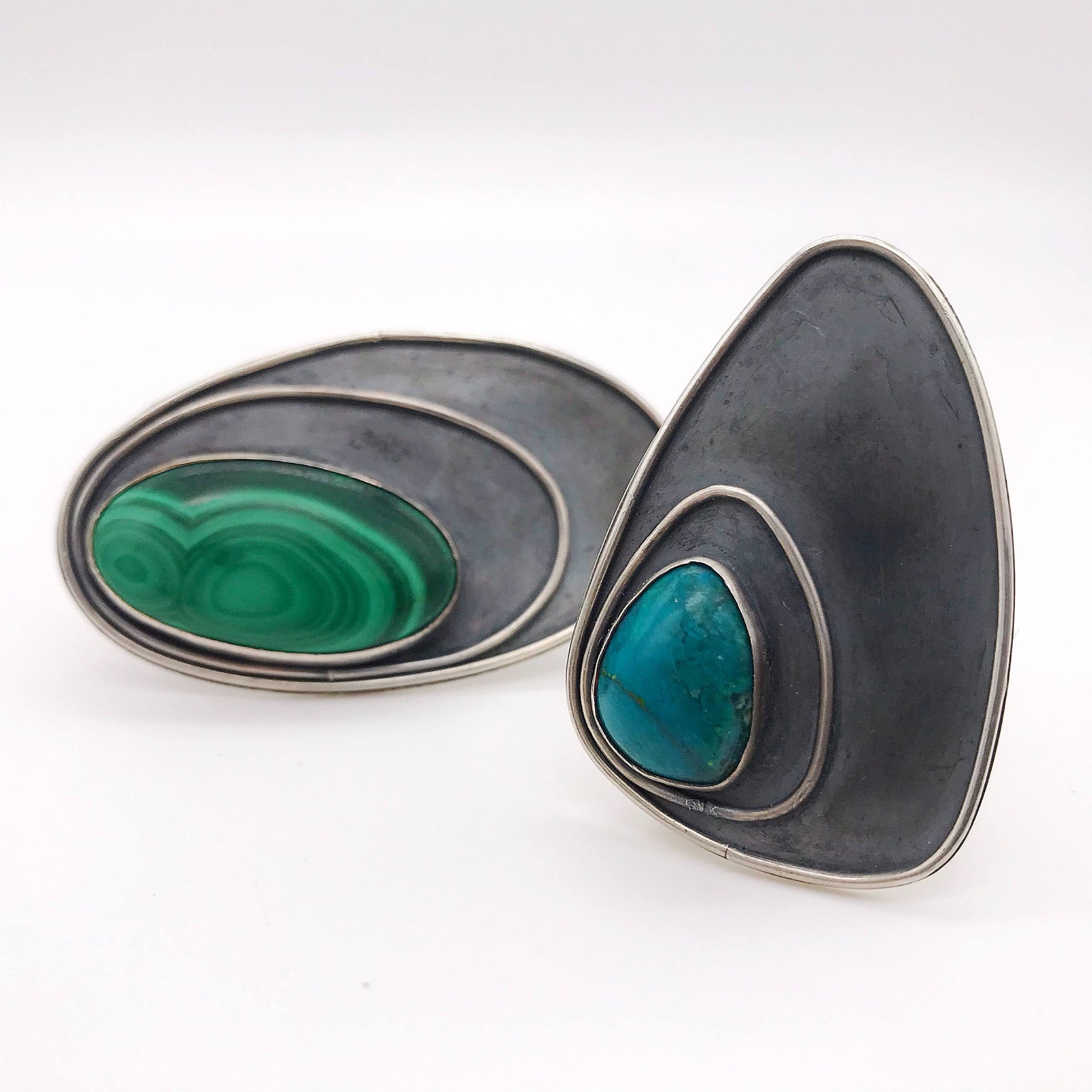 It is large yet comfortable to wear, and features a vibrant blue chysocolla from Peru. Best suited for your ring, middle or forefinger.